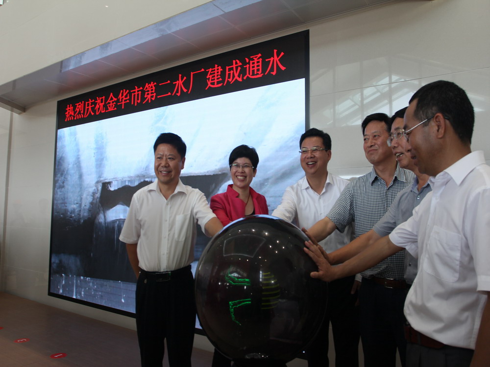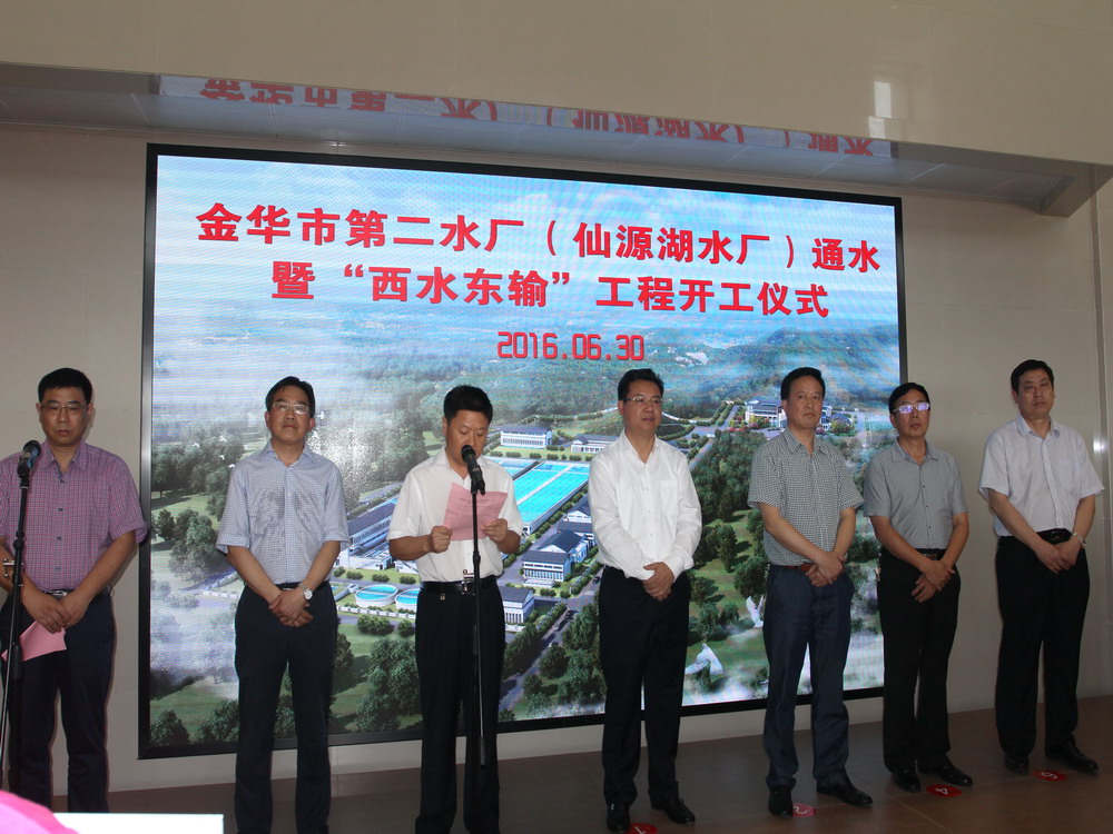 这天下午,在苏孟乡的金华市第二水厂(仙源湖水厂)办公楼大厅里,在工程建设各相关部门及建设、设计、监理等单位人员和市民代表、公司干部职工的共同见证下,金华市委副书记、市长暨军民,市人大常委会副主任钱世茂,副市长祝伦根,市政协副主席朱恒钱,江滨社区居委会主任金爱芳、公司总经理杜乐双一起手按水晶球,晶莹的球体顿时闪现光芒——市第二水厂(仙源湖水厂)宣布建成通水,“西水东输”工程也同步开工建设!大家报以热烈的掌声。仪式由副市长祝伦根主持,出席仪式的还有市政府秘书长周剑敏,副秘书长王跃平、市建设局党委书记、局长郭慧强等领导。