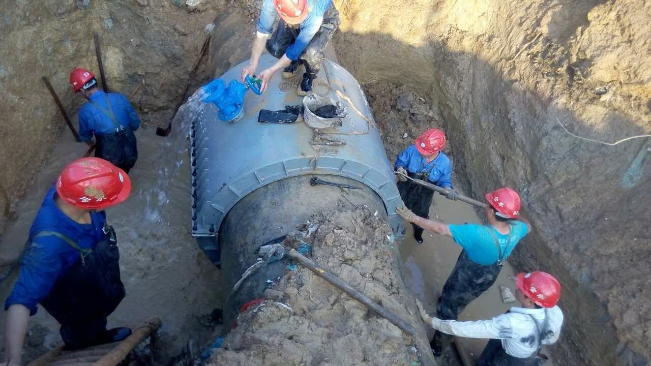 经过机械结合人工开挖,排水后发现为埋深2.5米处的dn1200水泥总管头子冲出,正在往外漏水。天气炎热,为了不影响市区正常用水,抢修人员决定带水作业,这增加了抢修难度。在抢修过程中,部分抢修人员还出现中暑征兆。抢修人员最终采用dn1200哈夫进行修复,经过连续抢修,