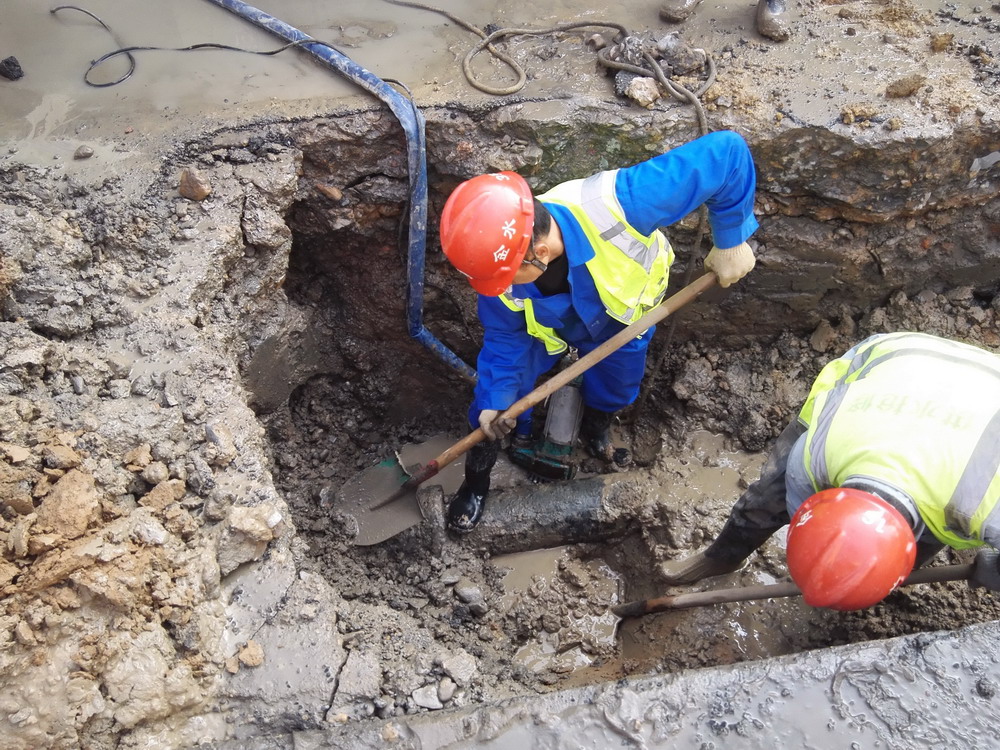 中午,公司应急抢修保障处接群众来电:河盘桥金华银行网点门口地面有水涌出,疑是自来水管道破裂。此时劳累了一上午的抢修人员顾不上中午休息,立即又携带相关抢修设备赶赴现场,当证实涌出是自来水后进行进行抢修,同时派出挖掘机赶往现场进行作业。经过挖掘机结合人工开挖,排水作业,发现为埋深2米的dn200铸铁总管漏水。