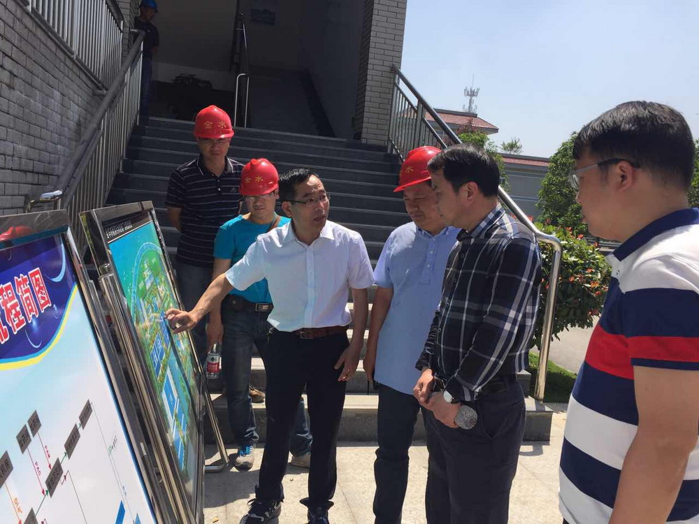 5月14日上午,金华市建设局党委书记、局长孙金荣在金华市自来水公司杜乐双总经理的陪同下莅临秋滨污水处理厂三期工程现场检查指导工作。