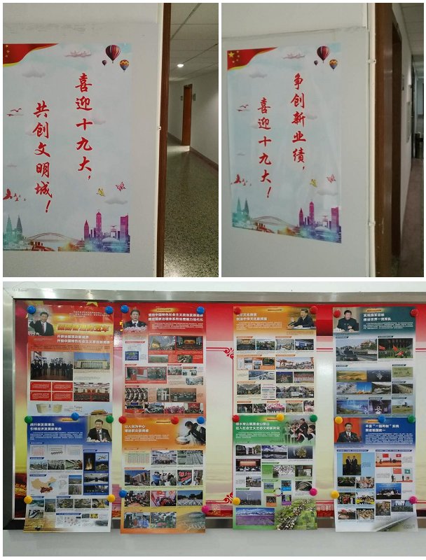 “以优异成绩迎接党的十九大胜利召开!”、“争创新业绩,喜迎十九大!”,一幅幅艳丽喜庆且振奋人心的主题标语醒目的张贴在公司办公大楼各个楼层、墙面。在公司楼厅宣传栏里,张贴了“砥砺奋进的五年”6幅宣传画,全方位的向公司干部职工介绍了祖国各方面建设所取得的新成就……为党的十九大胜利召开营造出浓厚的充满正能量的宣传氛围。