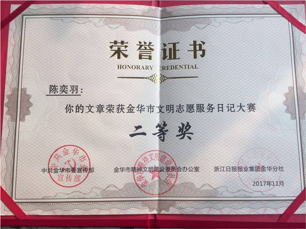 近日,由中共金华市委宣传部、金华市文明办、浙报集团金华分社联合举办的“文明志愿服务日记大赛”活动已圆满落下帷幕。本次大赛设一等奖5名,二等奖10名,三等奖10名,由金华市自来水公司选送的职工陈奕羽作品《亲身参与才能体会到不易》,通过层层筛选,从众多稿件中脱颖而出,荣获二等奖。