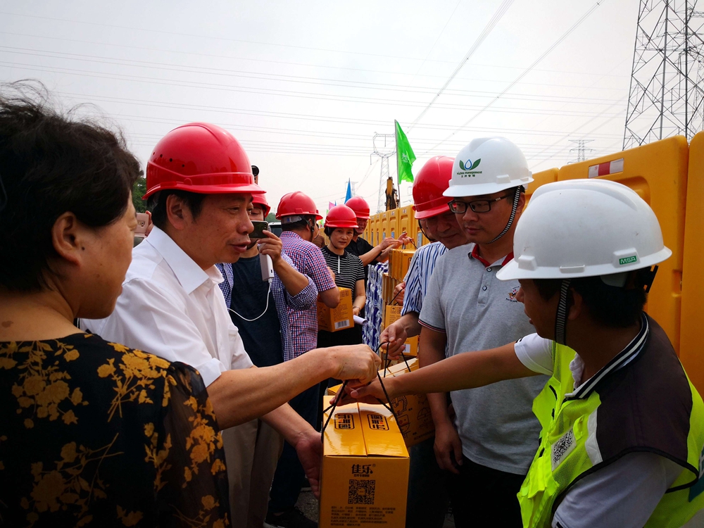 “天气这样炎热,你们辛苦了!”黄锦朝主任代表市四套班子领导向奋战一线的施工人员表示慰问,并与工人师傅们一一握手,感谢大家在高温酷暑天气坚守岗位、连日奋战,为尽早满足市区及金义都市区的居民们日益增长的用水需求作出的积极贡献。黄主任一行还为现场施工人员送去防暑降温用品。