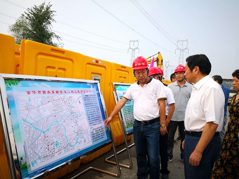 8月2日,金华市人大常委会主任黄锦朝、市政协副主席傅路红、人大常委会秘书长施美红和市总工会等有关领导一行到市重点工程西水东输二期工程工地现场,看望慰问奋战在一线的施工人员。水务集团筹建组组长陈汝森向黄锦朝主任一行详细介绍了工程建设进展情况。