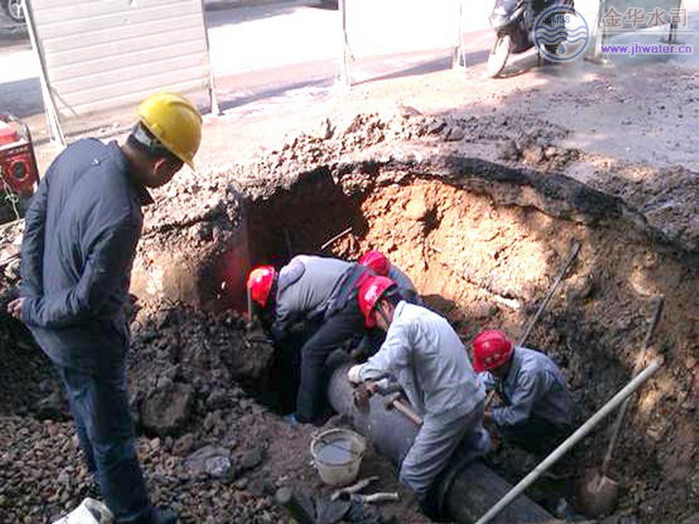 抢修人员在现场发现某施工部门正在义乌街上进行污水管道施工,大型机械施工时剧烈震动对附近地下给水管道造成了损害,结合现场情况分析,确认是横穿义乌街通往景德路的一处dn