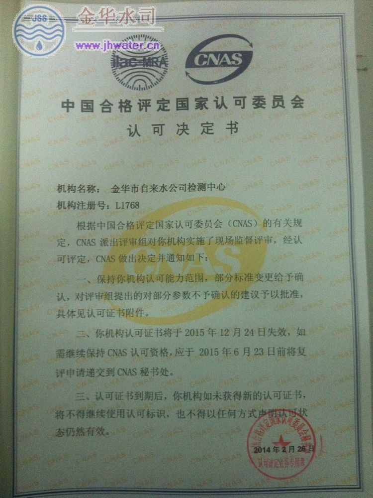 近日,金华市自来水公司检测中心收到中国合格评定国家认可委(cnas)维持认可证书。