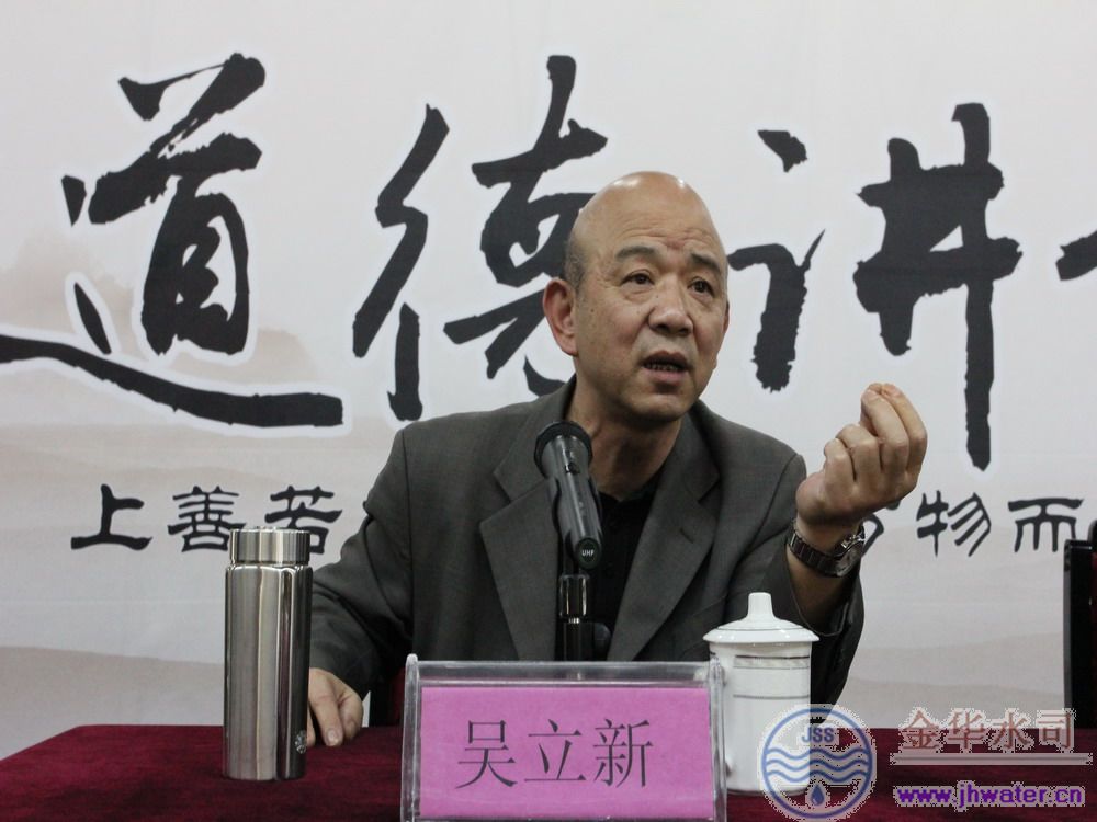 本次道德讲堂开讲,是公司按照党的群众路线教育实践活动部署,在学习教育、听取意见阶段,开展的一次“发现身边典型、学习闪光言行”专题报告会,由全国“五一”劳动奖章获得者、省劳动模范——金华市自来水公司总经理吴立新主讲,党委书记吴建诚主持,近200名员工参加。